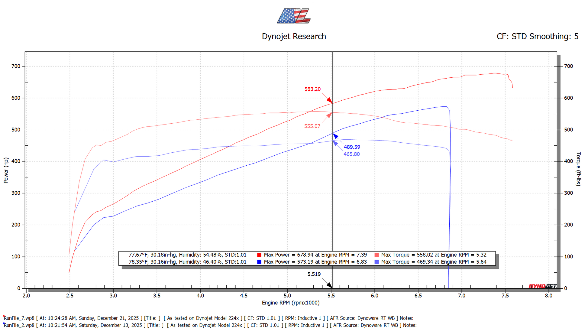 Below is a dyno comparison from Chris's 2024 Stage 1 Whipple F150 stock vs ML Stage 2 Tune Package.